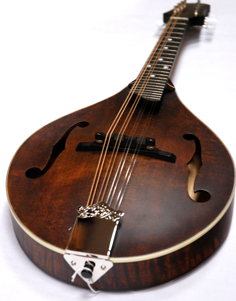 Solid Spruce Top, Solid Maple back & sides. Rosewood fingerboard & adjustable ebony bridge. A-style body with F-holes for liquid tones and excellent projection. Satin finish.