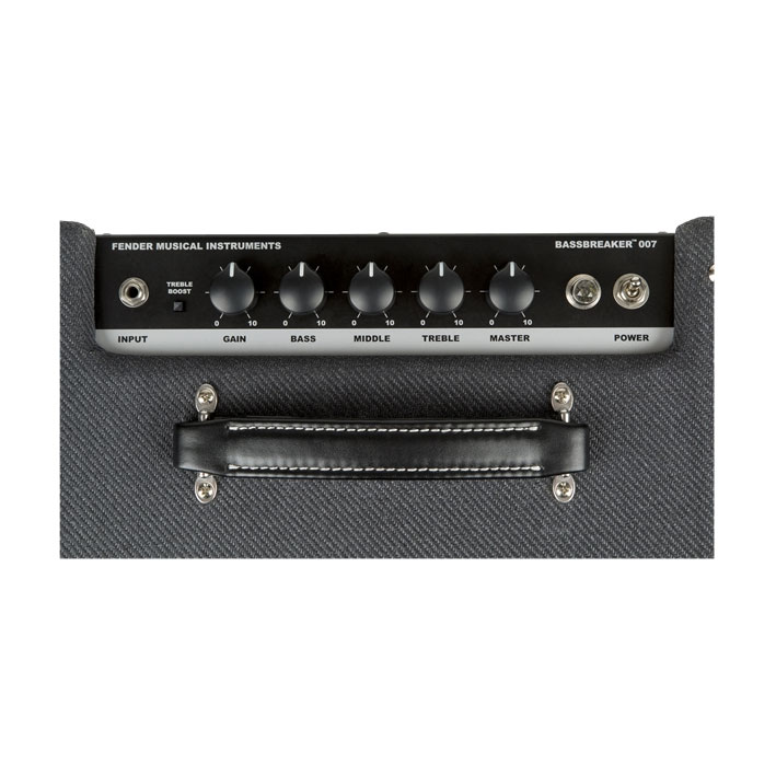 Powerful and unpretentious, the Bassbreaker 007 packs quite a punch for its size. Fueled by a pair of 12AX7 preamp tubes and a single EL84 power tube for 7 watts of true Class-A amplification, the Bassbreaker 007 features traditional gain and tone controls, and an interesting option— switchable vintage-style treble booster for increased overdrive and added harmonics. Higher gain settings of the 007 are just plain fun, but never mask the dynamics and identity of the guitar. The onboard ¼” line output connects directly to recording gear or a larger amp. Bold visual touches include block Fender logo, dark grey lacquered tweed covering, leatherette handle and big, bold pointer knobs.