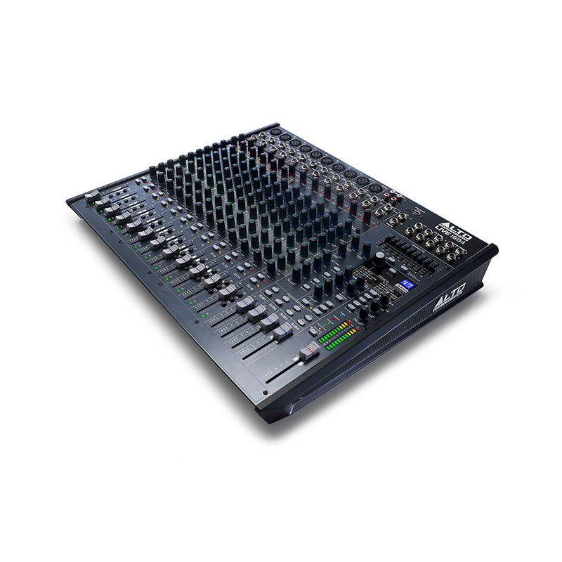The Alto Professional Live 1604 is a pro 16-channel, 4-bus mixer equipped with the tools you need to create the perfect mix. With flexible routing options and a multitude of onboard DSP tools, Live 1604 fits the demands of nearly any live performance environment. It features 10 balanced XLR inputs with switchable phantom power, 3-band EQs with sweepable mids for additional tonal shaping, four aux sends per-channel for external effects and monitoring, and a 9-band graphic EQ for main or monitor outputs. A headphone jack with an independent level control enables additional monitoring and mixing. 60mm faders with LED meters provide precise control and visual feedback for accurate, hands-on mixing. With its diverse connectivity options, Live 1604 can handle any sized event from small coffee house gigs to mid-sized ensembles to full-stage rock bands.