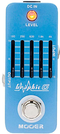 5 band Graphic EQ pedal with sliders to cut or boost 100Hz, 250Hz, 630Hz, 1.6KHz, 4KHz by +/- 18db and Master level control. It's the smallest Graphic EQ guitar pedal in the world fitting into a fully metal enclosure in Mooers' Micro size. Requires 9V power adapter (not included)