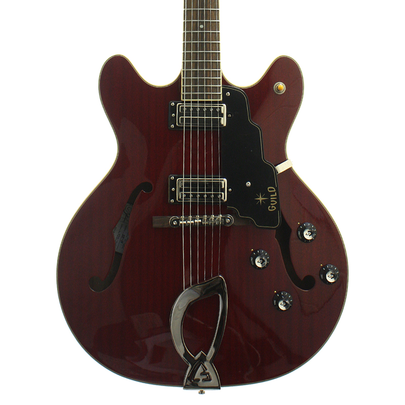 Evoking classic 60's Guild styling, the Starfire IV is a classy Semi-Hollow body Guitar that's capable of covering a wide range of styles. A Mahogany body, mixed with a 3-piece Mahogany/Maple/Mahogany neck means the Starfire IV is a warm and resonant instrument with a light, airy tone. The mellow LB-1 'Little Bucker' pickups lend themselves further to this, with a jangly, articulate sound. Other features include a pinned Mahogany bridge, individual Volume and Tone controls for each pickup, and a retro Guild Harp Tailpiece. The guitar also comes with a hard case. Overall a strong contender in the Semi-Hollow market, and a great player.